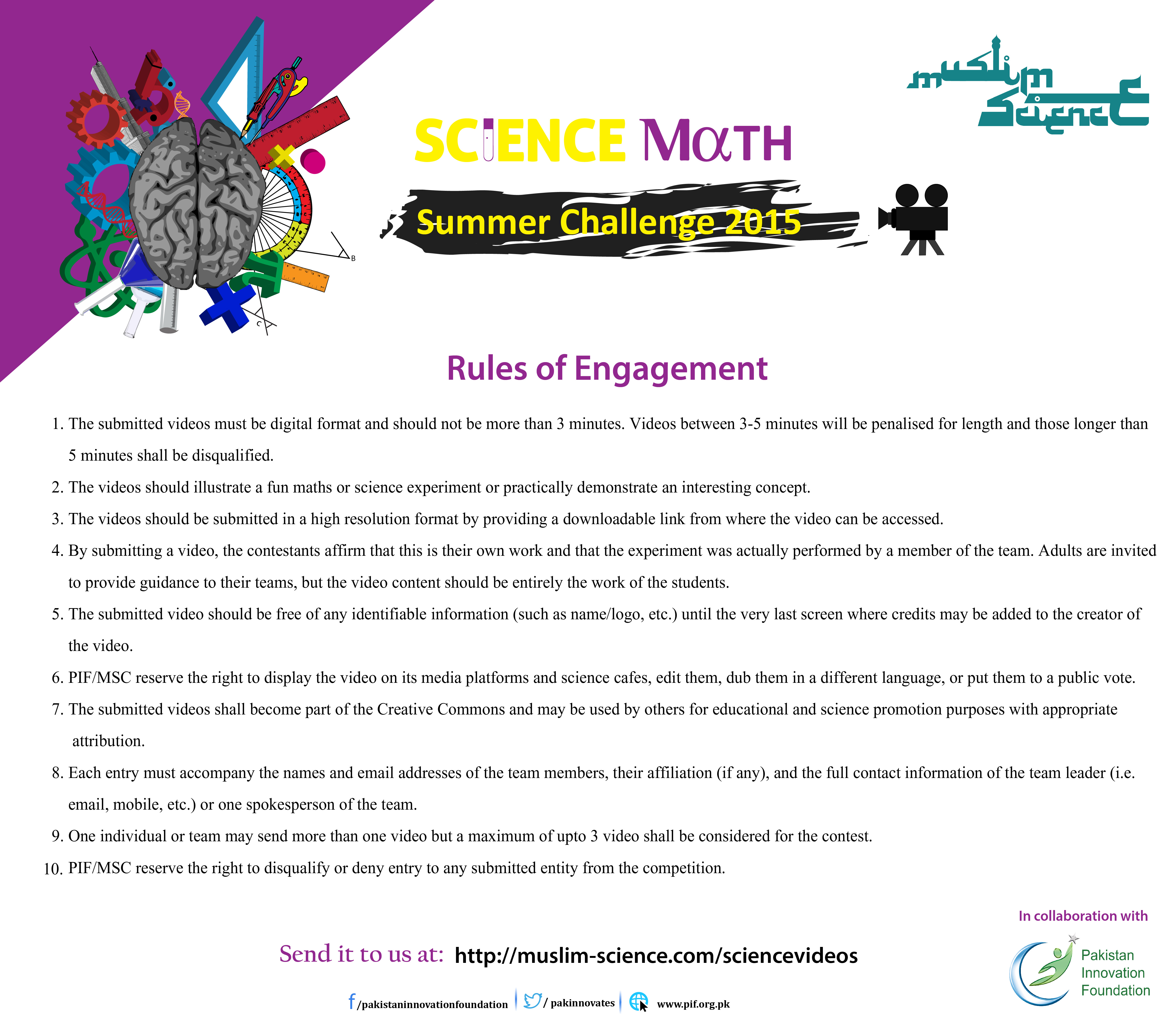 localhost/muslim Presents Maths and Science Summer Videos Contest 2015. Spend your summer making science videos that make learning fun and win fame and prizes! Make your video in any language - English, Urdu, Arabic, French, Bengali or Bahasa, add English subtitles (where required) and send it to us by August 14, 2015 for a Chance to Win! localhost/muslim will disseminate best videos and you will become part of a cause greater than yourself to spread the message of science across the Islamic World. Age Limit 21 years. Other conditions may apply (see Rules of the Competition).