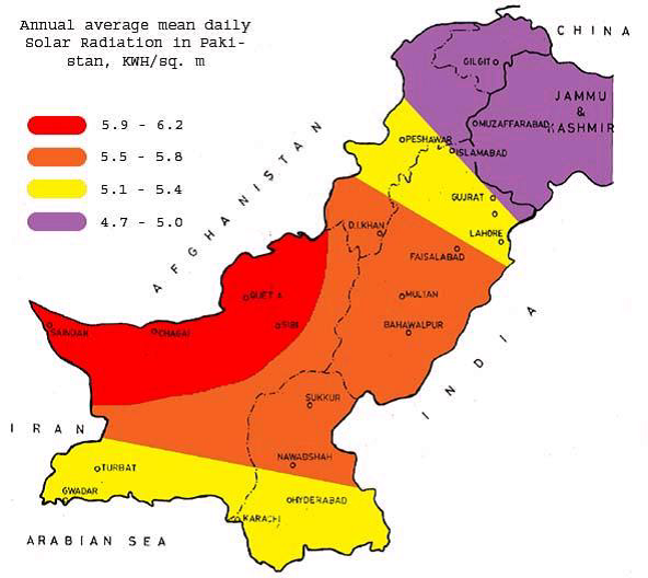 Pakistan receives over 320 days of extended daylight hours and high levels of average daily solar radiation energy (insolation) – 5.3kwh/m2 (1).